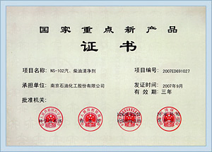 | Certificate of National Key New Product (NS-102 detergent for gasoline and diesel) |