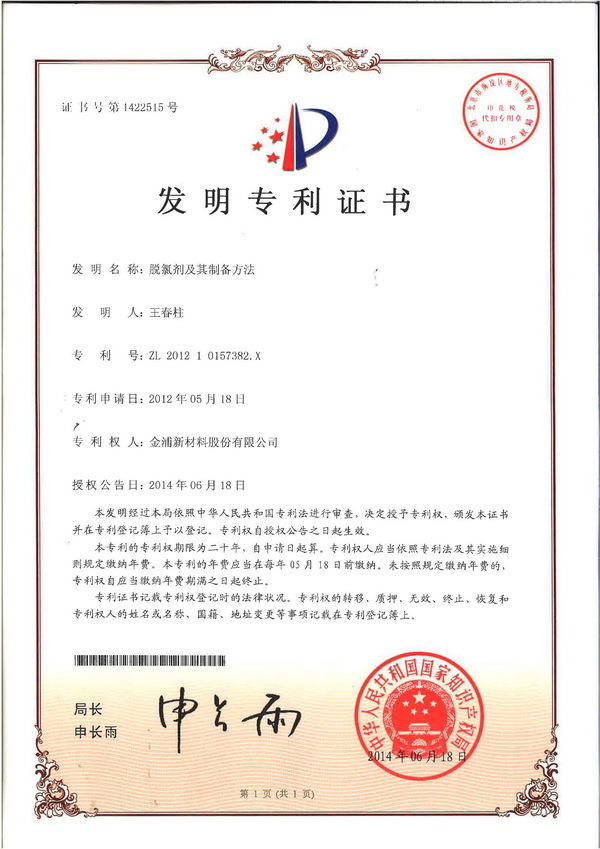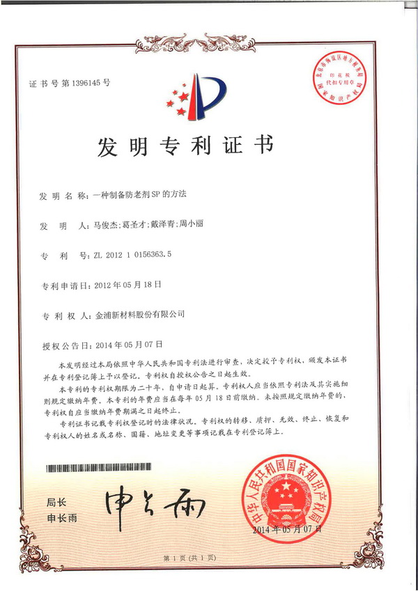 2014年二季度,技術中心兩項發(fā)明專利取得受理通知書:①一種水溶性復合緩蝕劑,申請?zhí)枺?01410191768.1;②一種液態(tài)產品中銻含量的檢測方法,申請?zhí)枺?01410203238.4。兩項發(fā)明專利獲得授權:①一種制備防老劑SP的方法,專利號:ZL201210156363.5;②脫氯劑及其制備方法,專利號:ZL20121015782.X。上半年,技術中心已經完成了全年制定的專利申請及授權計劃。